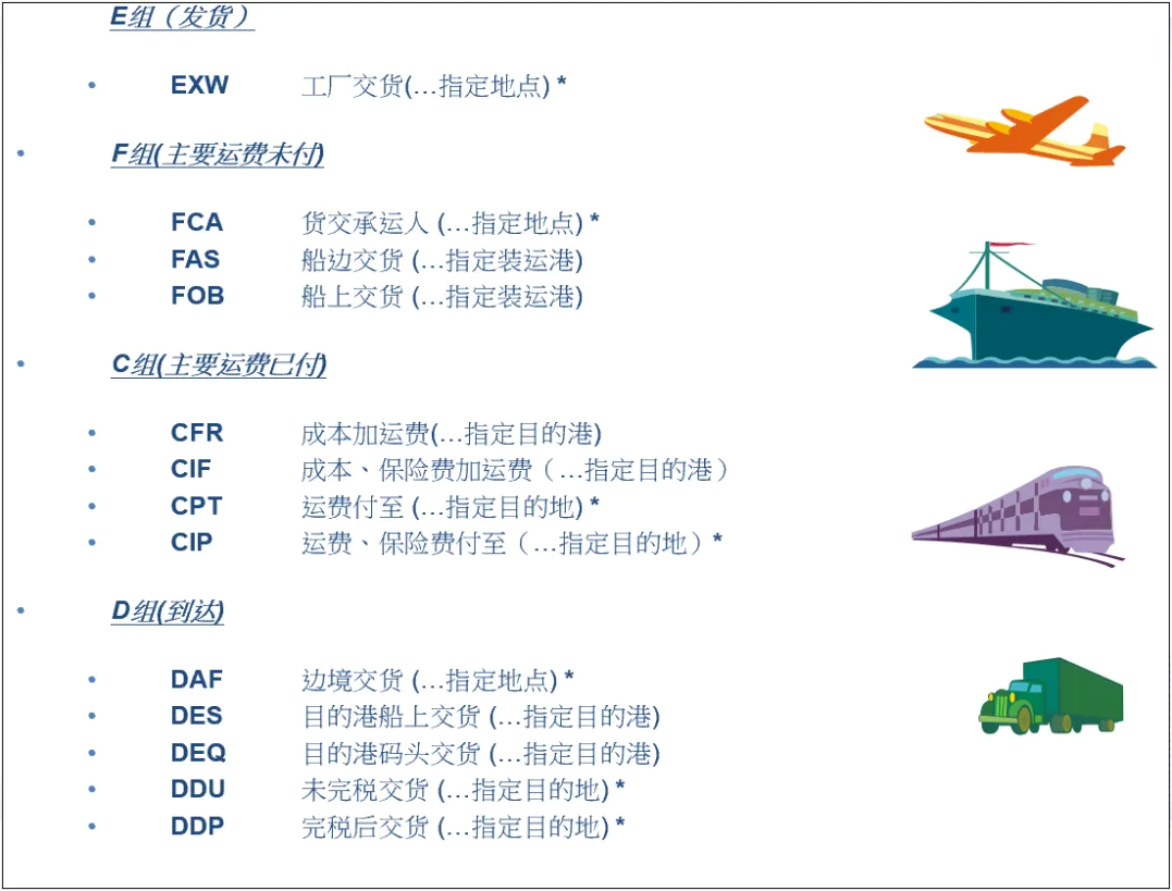 首先我们要清楚,贸易术语共分为四个族群,即E族,F族,C族和D族。请看简表及后面具体文字描述。
